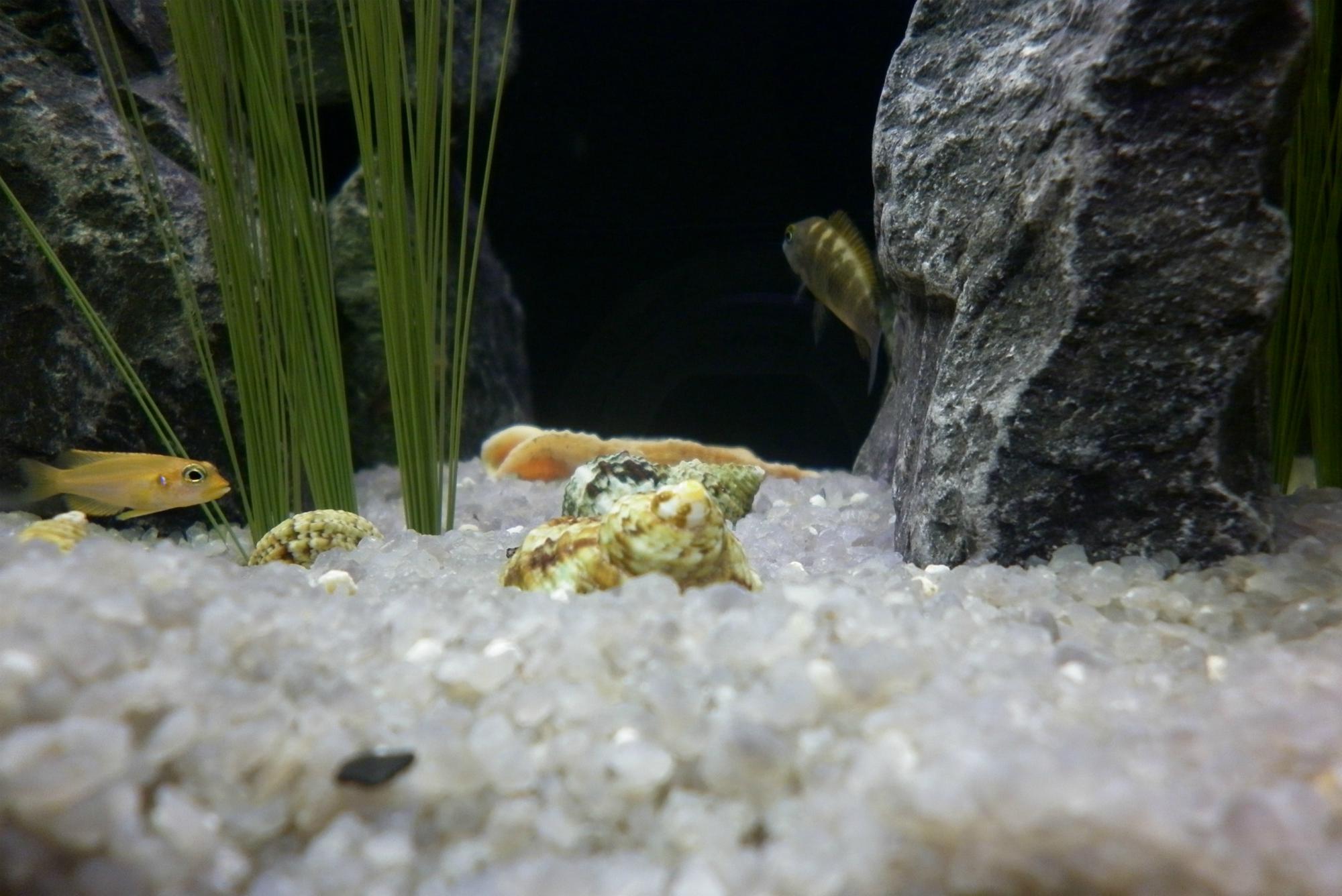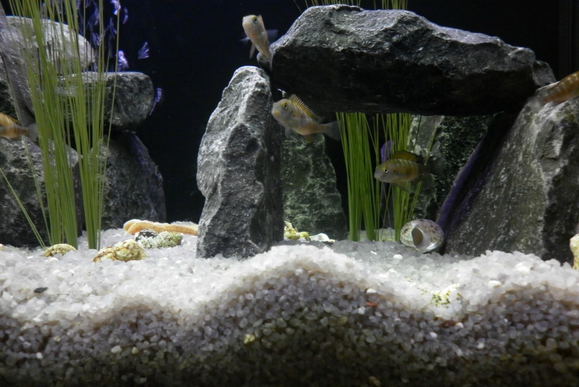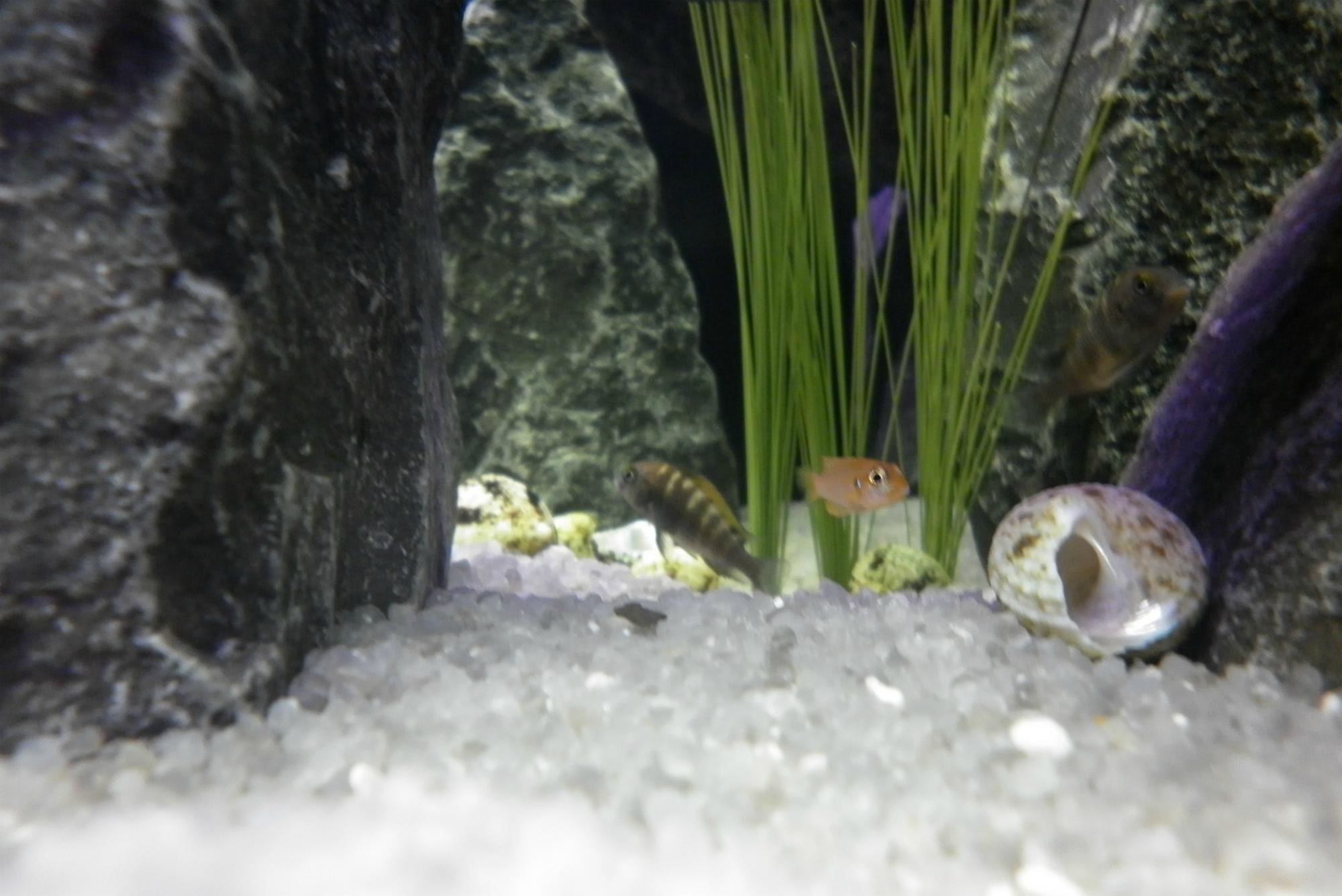 Было бы естественней, если б растения "росли" из камней, как бы пробиваясь через них. И крыши лучше поснимать. Как бы не попадали и не пришибли никого из обитателей. Хотя в целом аквариум очень симпатичный получился.