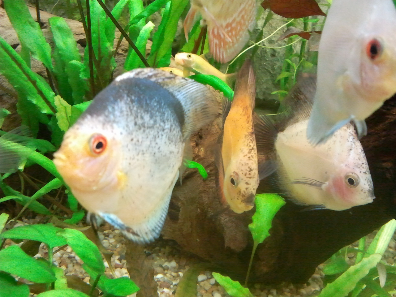 Здравствуйте, уважаемые дискусоводы.Прошу совета, т.к. я пока начинающий, посему сам боюсь натворить делов, ибо инфы в нете слишком много,в основном противоречивой,касающейся моего вопроса.Имеется 9 дисков размерами от 4 до 7 см, живут у меня около месяца.Сразу при покупке не заметил, потом пригляделся-у одного из них изначально были увеличены глаза( были и большего размера, чем у остальных, и более "навыкате"). Не обращал на это внимание, ну, думал попался "глазастик".Он довольно активный, всегда нормально принимает пищу(сейчас в основном заморозка артемии и начал кормить мидией).В последнее время мне показалось, что пучеглазие прогрессирует (или только показалось?),и не обратил бы внимание, если бы не тот факт, что сегодня другой однозначно не глазастый изначально диск выпучил один глаз(( и неохотно принимает пищу,все едят, а он чуть клюнул и отплывает, а все остальные вместе с ним со вчерашнего дня стали очень пугливы, даже при кормежке может быть несколько раз такое: ни с того не с сего кидаются в рассыпную, а корм тихо падает на дно...потом все же подбирают,но раньше так не шугались.Начитался про туберкулез и водянку, крыша едет-как правильно лечить, и нужно ли.Единственно что, пока не делал тестов воды-может ли это быть причиной повышенного аммиака или чего-либо еще.Аква 350л,грунт+растения(не так много), внутр. фильтр Juwel с биосубстратом, аэрация, подмена 35% раз в неделю,температура 29-32 град
