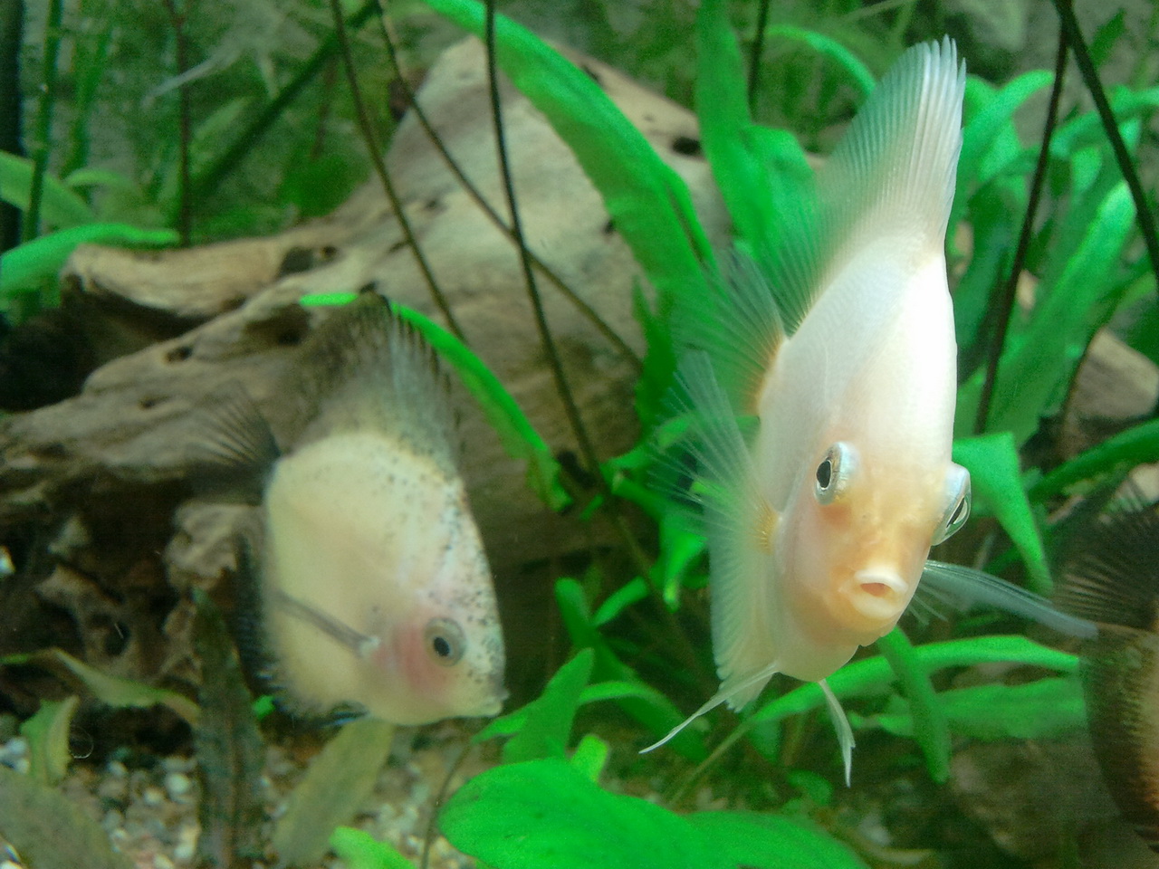 Пока изменений особых нет, кормом плюются, но едят, кроме одного из пучеглазых, который отказывался есть и пару дней назад-т.е. он со всеми в стайке, но ест очень вяло(( А еще заметил, один из "здоровых" пару раз тиранулся об растения.Вода в акве 32-34 град, уже сутки, сколько еще можно держать такую температуру(слышал макс 2 дня)