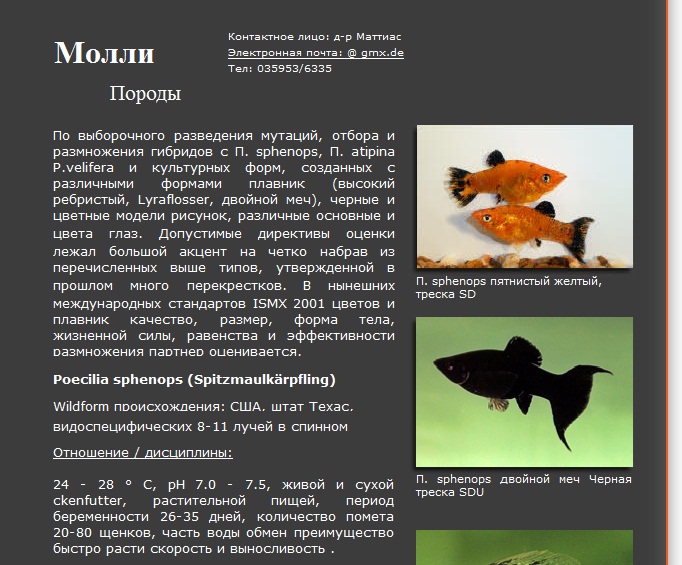 sky_amsterdam, На Ваших фото моллиенезия сфенопс. Лет пятнадцать назад у меня были чисто желтые с плавником лира. Некоторый % в помете рождается с менее-более черным крапом и черными отметинами , которые с возрастом исчезают или частично уменьшаются. Если в разведение отбирать родившихся чисто желтых , то соответственно в пометах увеличивается % чисто желтых. Самки начинают плодоносить после 5 месяцев , крупные поздние самцы определяются до года. Информации в инете много . Неплохая статья в Российском журнале "АКВАРИУМ" № 2/2003г. Немного инфы о сфенопс. Форма "Блек молли" получена в Новом Орлеане /США/ в конце 20-х годов. Разновидность "Молли-лира" появилась в Сингапуре в конце 40-х. В настоящее время создано множество цветовых форм и форм с различной геометрией плавников и корпуса /в часности баллон/. Особо в этом деле преуспели азиаты. В Европейских и др. цивилизованых странах работают стандарты молиенезий , где разведение "нежизнеспособных" форм типа баллон ограничена. На фото 3, 4 фото дающее некоторую инфу - перевод "не литературный" но по смыслу понять можно.