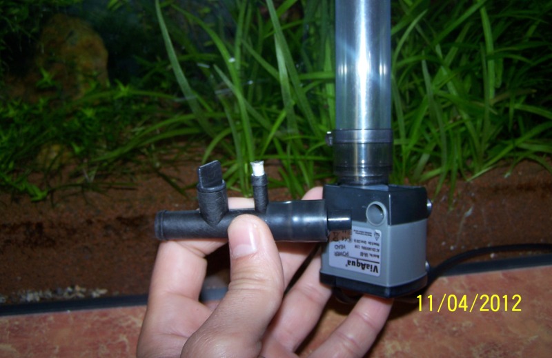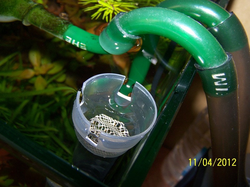 В бщем виде процесс представлен на фото. Для крепления колбы водозаборника из полиэтиленовой пробки (запчасть №4) была вырезана переходная муфта и приклеена на крышку турбинной камеры помпы. Также понадобилось срезать верхнюю часть крышки помпы, что не повлияло на целостность помпы и позволило задействовать имеющиеся на ней присоски для крепежа конструкции на стекло. Мерный колпачек от удобрений также был слегка модернизирован под нужды конструктива: срезано дно под диаметр трубки (чуть меньше 2,5 см для плотности надевания) и вырезаны 3 отверстия для забора пленки с поверхности воды. Да, ОБЯЗАТЕЛЬНО наличие сетки в верхней части заборной трубки для предотвращения попадания неразумной любопытной живности (вроде той, что на фото), под лопасти турбины помпы. Регулировка силы всасывания воды с поверхности осуществляется с помощью краника на тройнике и глубины погружения всей конструкции (в рабочем режиме верхняя часть колпачка выше поверхности на 3-5 мм) . Готовый девайс после регулировки работает совершенно бесшумно и весьма эффективно. Приятного вам рукоделия
