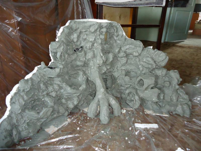Теперь по созданию фона-каркас из пенопласта,обьем из пены,затем 7 слоев цемента с церезитом.Пенопласт с пеной ебрал строительным феном до состояния нулевой плавучести,т.к. не хотелось портить силиконом стекло, фон не красил,ни чем не покрывал, в таком состоянии уже 1,5 месяца,рыбасы чувствуют себя великолепно.