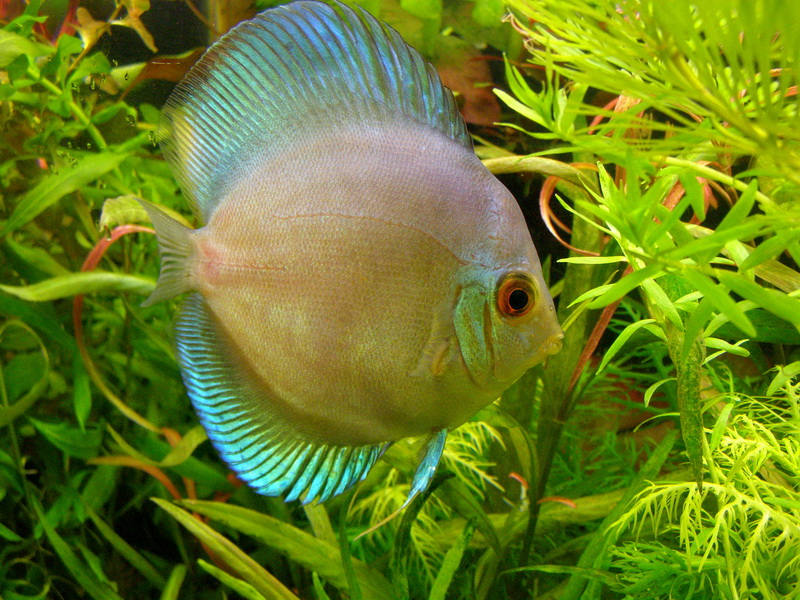 Два взрослых дискуса - самка "Blue diamond" (ок. 12 см с хвостом) и, предположительно, самец то ли "Cobalt", то ли помесь Blue diamond с кем-то (ок. 9-10 см с хвостом), хотя покупал малышом как "b. diamond". Рыбе более двух лет.