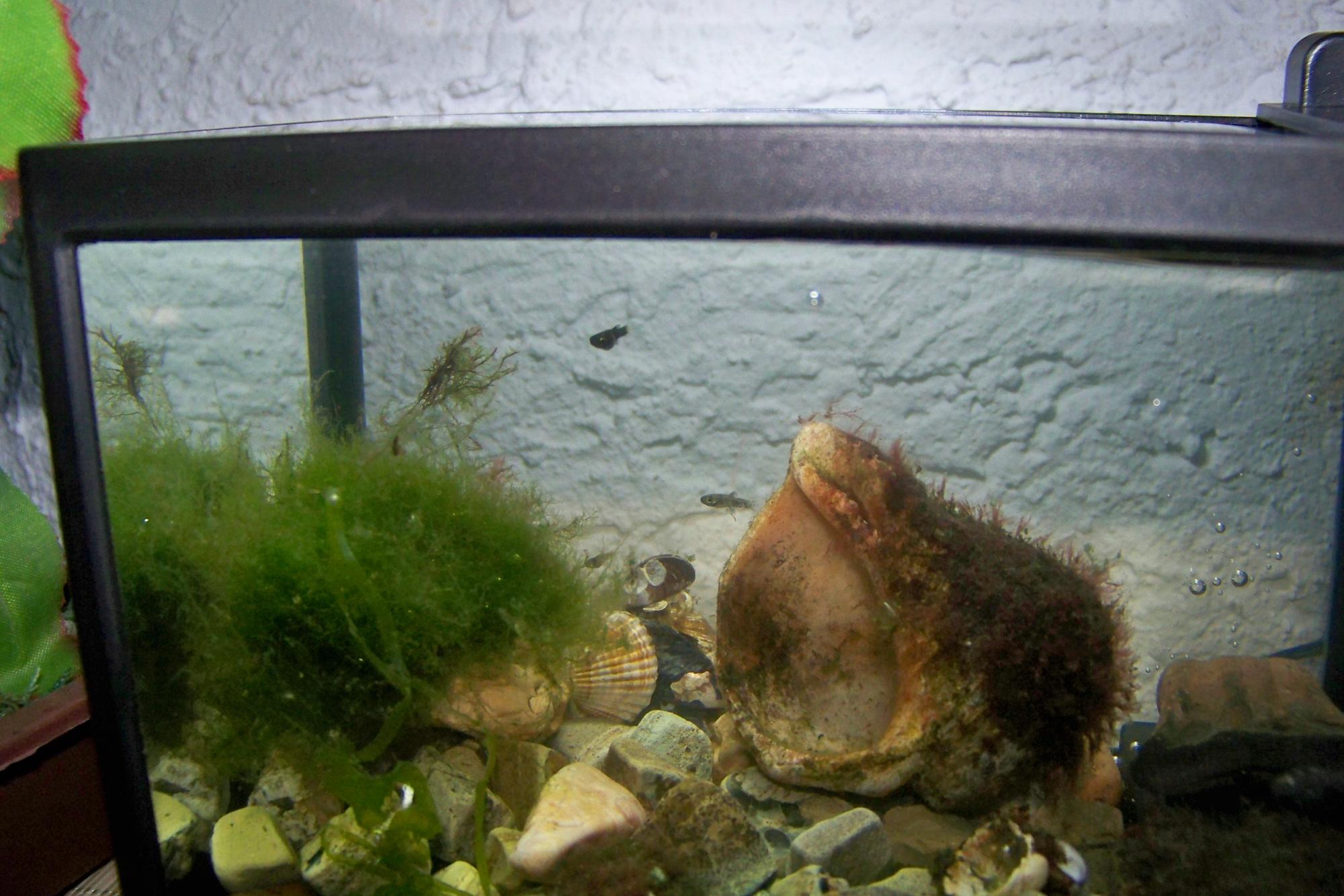 В первый день в аквариум были посеслены несколько мидий. Этот моллюск интересен тем, что периодически меняет место посадки: за ночь мидии расползлись по аквариуму, облюбовава себе в основном укромные места.