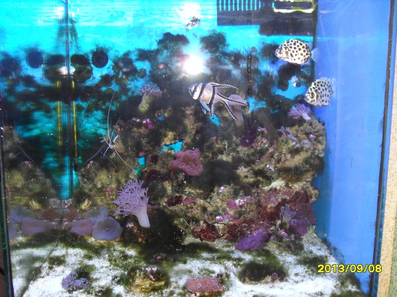 Прошло 5 месяцев. Завал полный. Начну по порядку. Справедливости ради скажу, что бластомуса выпустила 3 новых полипа, появилось несколько новых дискосом и юма разделилась на 3 части. Остальные кораллы или погибли или находятся в плачевном состоянии. СПСы посаженные в акву практически сразу начинали облетать снизу. Купленная актиния квадриколор не долго думая, уменьшилась до размеров пуговицы и в таком состоянии находится несколько месяцев, что не мешает ей принимать пищу в виде кусочков кальмара ( на фото на задней стенке можно ее увидеть). Короче денег потраченных на погибшие кораллы хватило бы на новый светодиодный светильник. Так-же практически сразу полезла нитка. Полезла так, что весь аквариум похож на сплошной зеленый ковер. Пытался пропалывать. Бесполезно. Через неделю все становилось как прежде. С таким трудом клееная конструкция из жк и казавшаяся очень симпатичной в плане дизайна, оказалась совершенно непригодной для нормальной жизни кораллов, т.к. создавала много затененных участков, а места для посадки практически не было. Было решено принять меры для изменения ситуации, но с учетом сильно урезанной статьи бюджета предусмотренной для аквы. Вода осмос + колба с ионообменной смолой. Ежедневная подмена 1 литр + 0,5 литра долив. В заднем так называемом сампе, в первом отсеке хетаморфа, во втором уголь и пенник ресан 300, в третьем губка и возвратная помпа. Конструкция из жк была разобрана. После всех изменений визуально состояние аквы осталось прежним. Последнюю неделю свет включаю на 1 час. Надеюсь нитка начнет отступать. Склоняюсь к постройке сампа, но прежде планирую посетить Донецких моряков по приглашению Андреея-TakedaMaru, чтобы воспользоваться их опытом. С Олегом-Дейви Джонс уже познакомился. Размеры будущего сампа с учетом размеров тумбы 34х38см, причем 38 ширина до задней стенки, высота возможна до 50см. В акве стенку сампа уберу. С видом слива еще не определился. Буду рад любому совету по устройству сампа и переливу. Как только появиться возможность закажу светодиодный светильник у Spam4eg. Ожидая вопрос о показателях воды отвечу: тестов нет. Пару месяцев назад просил Макса сделать тест воды. Серьезных отклонений замечено не было. Качество фото плохое. Одно со вспышкой, второе без.