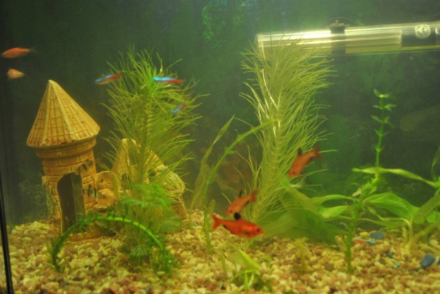 Добрый день, подскажите пожалуйста вчера 25.09.12 купил аквариум на 50 литров, заранее сутки стояла вода отстаивалась, крышка аквариума стеклянная без ламп света, вчера попробовал направить с вверху настольную лампу с лампой накаливания понял что ерунда, купил за 10 грн водоросли, и 2 кг цветного грунта и так вопросы которые хотелось бы решить чтобы рыбам хорошо жилось,сейчас там плавает 9 рыб 5 неонов, (2 золотые и 3 полосатых - к сожалению по не опытности не спросил их название днём буду дома скину фото надеюсь вы поможете определить их разновидность)