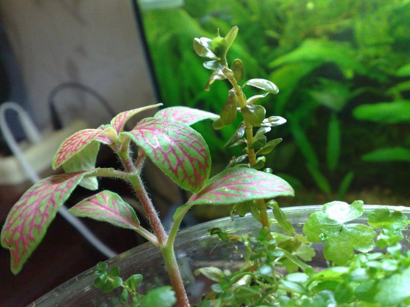 Предварительные планы таковы: примерно через неделю обросший мхом горшочек наполняю питательной смесью, пересаживаю туда фиттонию и размещаю в её баночке, также посажу еще некоторые аквариумные растения, которые буду приучать к воздуху (какие - еще в раздумьях) ... еще через недельку состригаю ситняг, опускаю уровень воды и высаживаю уже "воздушные" хемиантус микрантемоидес и гидрокотилу трипартита (они у меня уже адаптированы), их фото, пока растущих в акве, ниже ...