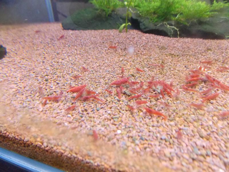 Лот - 10-15шт креветок Neocaridina Cherry. 50% креветок - слабо окрашенные самцы, 50% - самки, которые при освещении нормальные сакуры, но ночью и при стрессе бледнеют. Размер 1 - 2см. Некоторые самки уже с икрой.