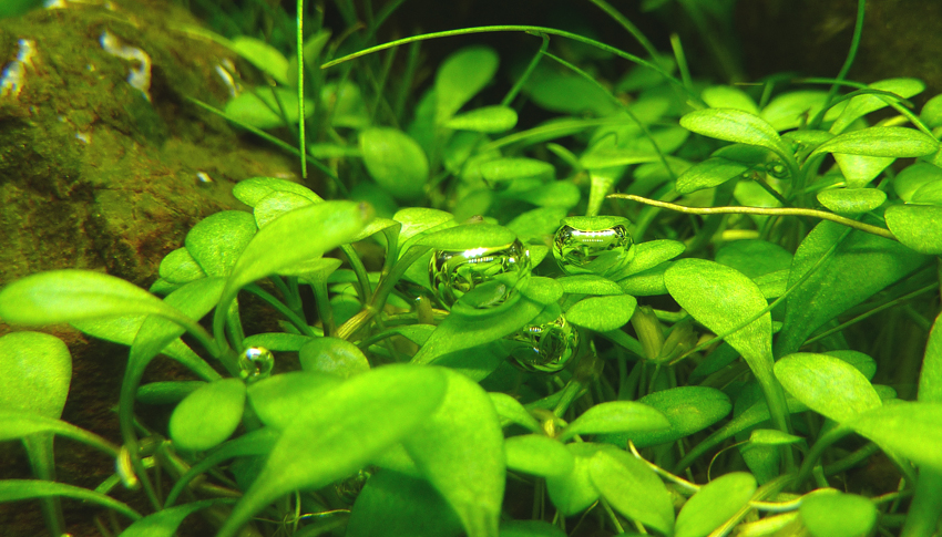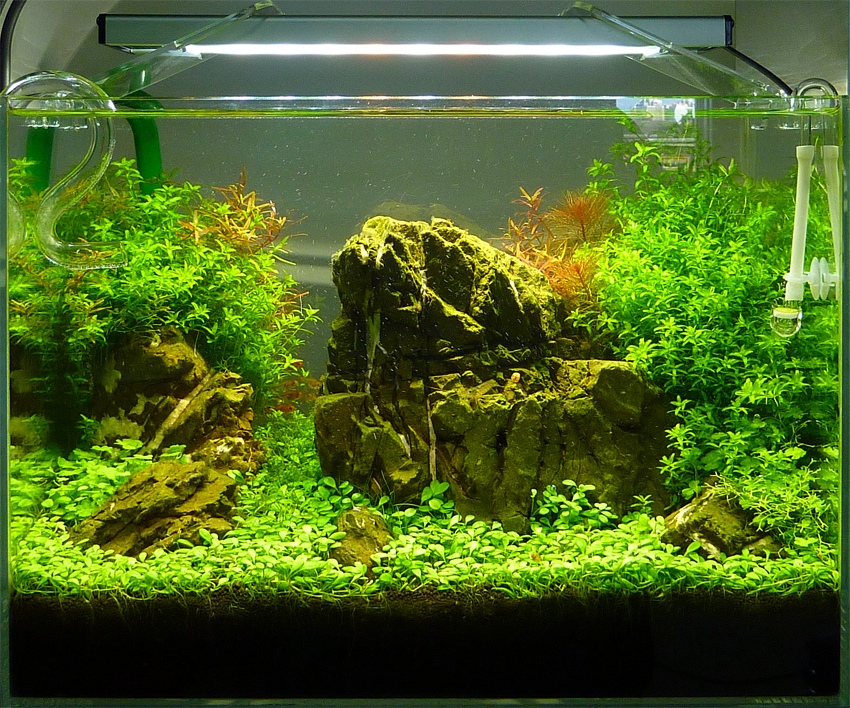 Самое главное - свет. Светит ярко, я не ожидал. По аквариуму сразу забегали зайчики, как от МГ, на стеклянных поверхностях замерцали разноцветные блики, аквариум стал выглядеть хрустальным. Красиво. Через полчаса растения запузыряли, по-моему, активнее (но точно не меньше), чем с моим предыдущим светильником. Это тоже очень хороший показатель.