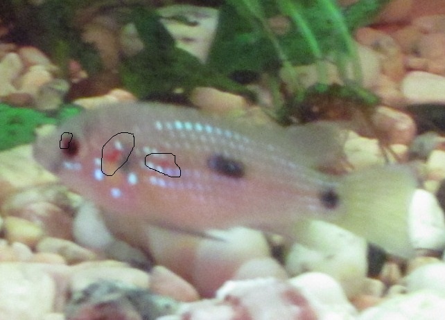 Здравствуйте! Помогите пожалуйста определить болезнь рыб, если таковая имеется. У карликовых цихлидок на теле красные пятна, как ранки, но с обеих сторон за жабрами. Рыбки ведут себя как обычно, аппетит хороший вроде.