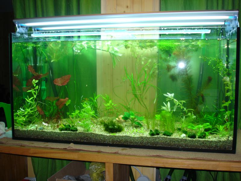 На фото вид вчера вечером. Критика и советы приветствуются, так как таких больших аквариумов у меня не было раньше.