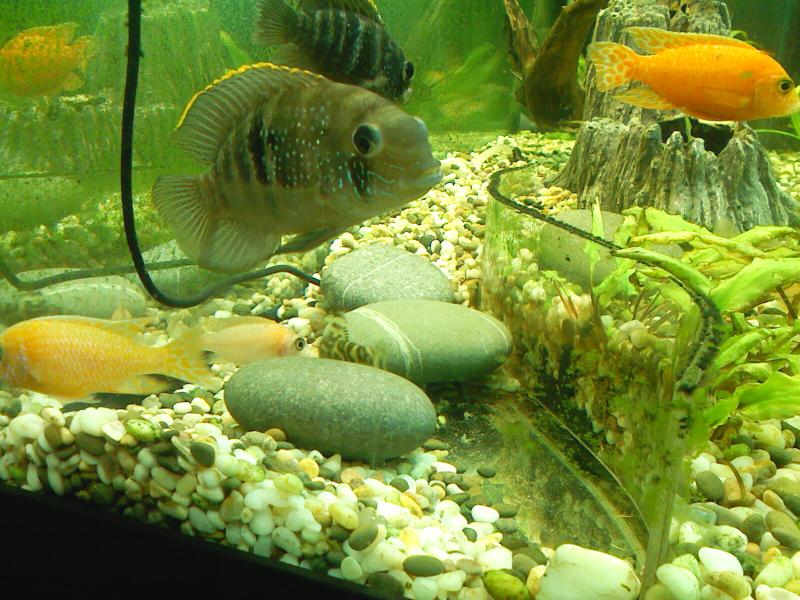 Роют - в основном самец оранжевый, тот, что справа в верхнем углу, которые жёлтые поменьше - это его дети, тоже скоро начнут, а голубовато-пятнистые акары - вот самец крупным планом, а за ним самочка, так эти не копают грунт, они чистят те круглые камни и периодически откладывают на них икру.