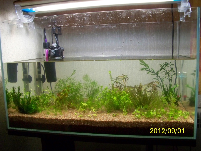Аквариум полностью залит водой, смешана отстоянная водопроводная с осмосом (из магазина), примерная пропорция 60%/40% осмос. В аквариум добавил 5 кликов Биостартера (бактерий) от Ермолаева, поскольку вода была все-таки белесовато-мутноватая, все-таки она вся новая, старая вода осталась только в грунте.