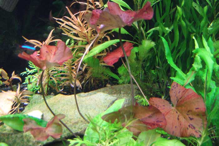 Вода - мерзкая оболонская, фильтр - внешник Sera 1300, дополнительной аэрации нет. Подкормка - глиняные шарики GBL. Грунт - гранитная и базальтовая крошка. Освещение - 6 ламп по 36-40 Вт. УФ - Атман 9 Вт. Температура - 27 С. Остальное - в профиле