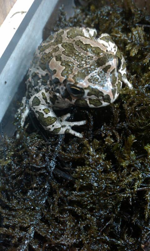 На этих выходных отвёз загород ещё двух. Осталисть три самых крупных, которые охотно ели мясо на палочке. Так что из опыта одновременного содержания (пусть и недолгого) девяти зелёных жаб разного возраста, можно уверенно сказать, что чем старше жаба, тем быстрее и проще она адаптируется к жизни в неволе. Сейчас самая крупная жаба (6 смростом) спокойно сидит на руках. Две чуть поменьше на руках не сидят, а ходят, могут спрыгнуть.