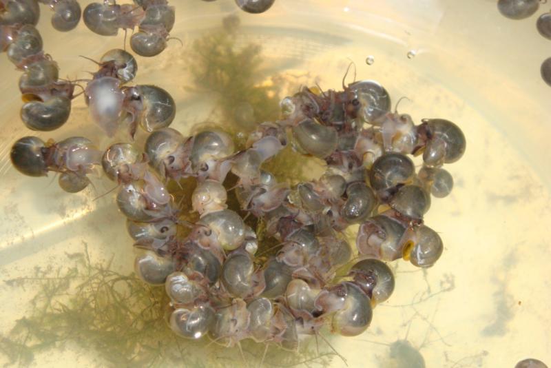 Улиточки активны, веселы, воспитаны с отличным аппетитом. Выращены на сомовьих таблетках, капусте, огурчике, сушеных листочках. В этом возрасте они активно чистят аквариум от обрастаний и излишков пищи. К растениям равнодушны.