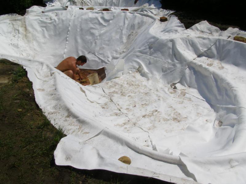 Котлован биоплато, укрепляем сначала линолеумом, много корней в стенах, грунт насыпной.