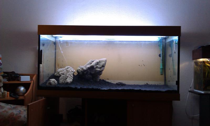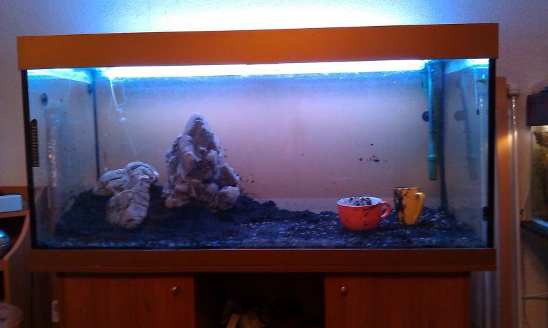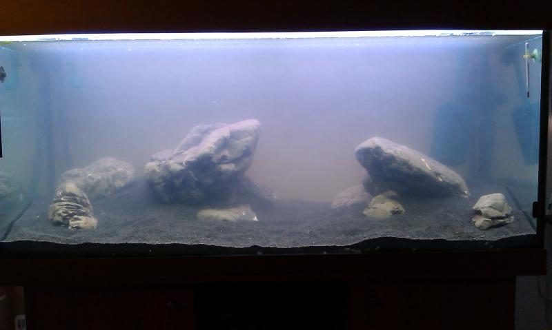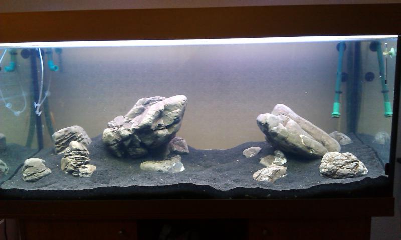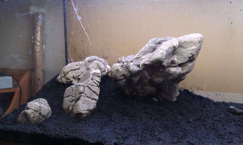 самым первым делом это была подложка под камни, был куплен пенопласт плотный\мелкопористый выстелен на дно, дабы избежать трещин. после, субстракт Тетра 1-1.5см, плюс россыпь добавка для грунта Тетра и все это засыпаем мелким базальтом, строю горы и выкладываю камни по задуманному сценарию. на данный момент, предварительно, выставил левую сторону аквариума на правую не хватило сил и желания, да и камня большого нет будем звонить Саше и просить еще..