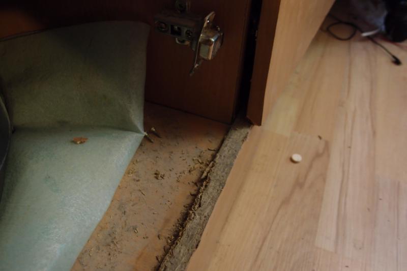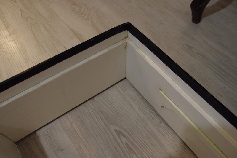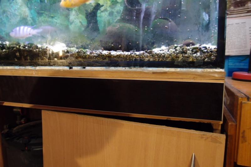 Но на смену одним страхам пришли другие. Тумба нуждалась в капитальной переделке. Вода, которая периодически стекала по стеклам от разборок шалуна паку (50см, 3,2кг) с араваной, дала о себе знать. ДСП разбухло везде, где было только можно, столешница дала прогиб в середине больше 10мм (как выдержало дно банки ума не приложу), так что стекло посередине висело над пенопластом с зазором больше 1мм, т.е. свободно. Боковые стенки по торцам разбухли. Нижняя часть тумбы просела под нагрузкой и дверки нормально не закрывались. если бы не мет. каркас, все бы давно было бы очень плохо.