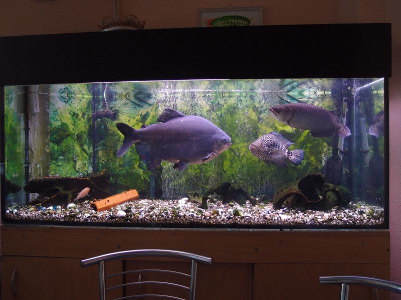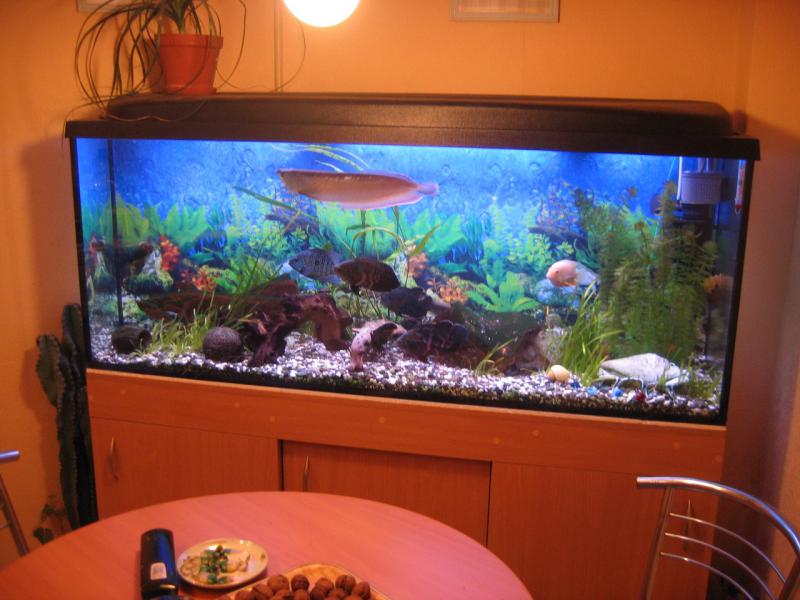 Аквариум появился в начале 2006 года, был склеен пятиугольной формы из-за формы угла, куда его планировал поместить. А так обычный полутонник - 150х50х60. Тумбу сделали из металлического каркаса, обшитого ДСП. Каркас был из уголка, что имело свое нехорошее продолжение. Через полгода аквариум был укомплектован Флювалом ФХ-5, подвел протоку. Еще через пару лет заменил фабричную крышку на самодельную из ПВХ. Жили астронотусы, манагуанцы, паку, аравана.