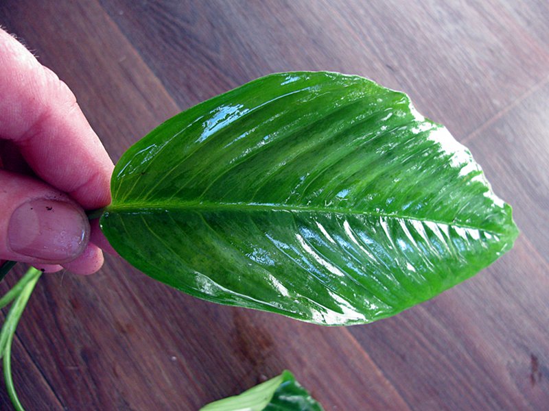 Очень красивая гофрированная листовая пластина с интересным узором (две белые линии по бокам от центральной жилки).
