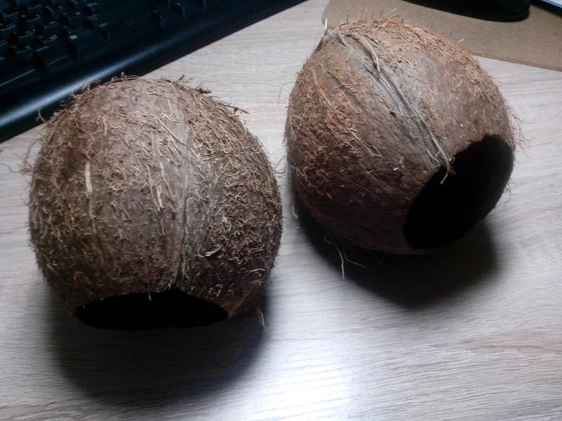 Могу по желанию аккуратно распилить кокос с отверстием (домик 8-) на две половинки. Такая пара гнезд будет стоить 40 грн.