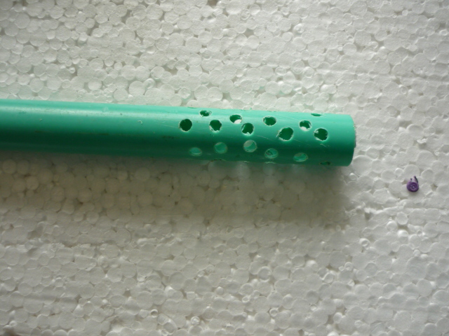 В пластмассовой трубке сверлим отверстия, заглушаем отверстия трубки куском шприца (заглушка нужна для того чтобы щебень не попал в трубку, но об этом ниже) и фиксируем его с помочью палочки от чупа-чупса (рис.6).