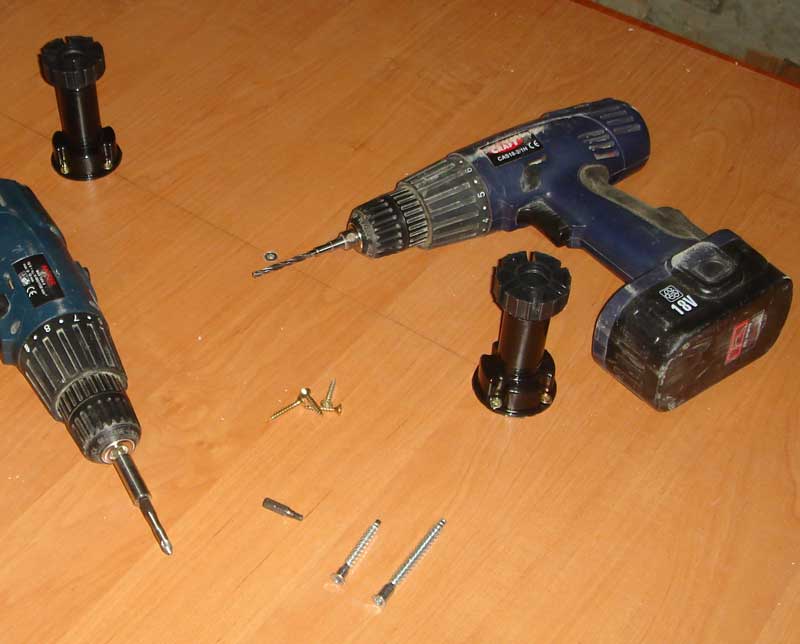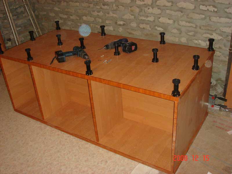 Далее встала проблема выбора ног. Поскольку пол был сделан с уклоном, ноги должны были быть регулируемые. Мой выбор пал на кухонные пластиковые ноги производства Италии. Поясню. Встав на ногу и попрыгав на ней, я убедился в том, что с ней ничего не произошло. Раз нога выдерживает статическую нагрузку в 100 кг и динамическую ИМХО 150 кг, я решил не тратить особо денег на 18-кратный запас прочности.  Ноги устанавливал из расчёта 4 ноги на вертикальный ряд банок, таким образом не превысив расчётные 100 кг на ногу.