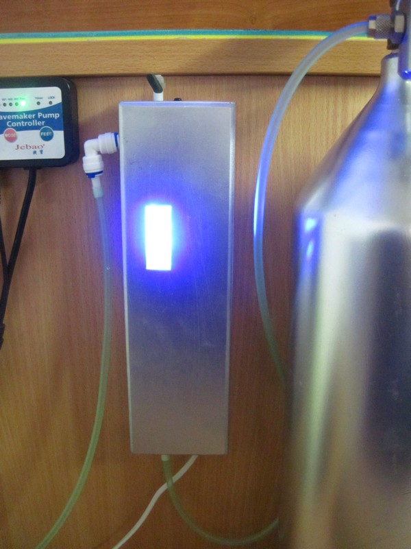 Первая (справа налево) секция заполнена биошарами. Это собственно реактор для растворения СО2. Подобные реакторы широко используются в пресной аквариумистики. Не скажу как там эффективность биошаров в "био" плане, но для реакторов СО2 незаменимая вещь.
