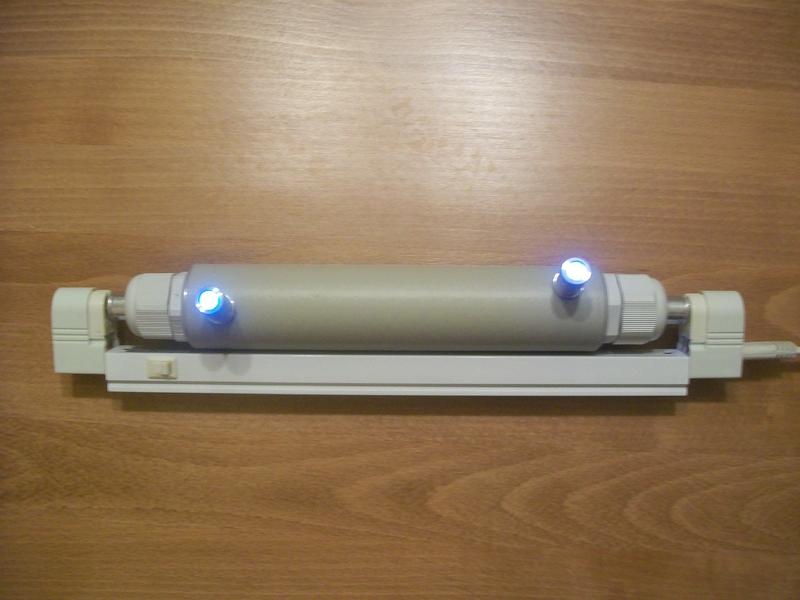 Итак: созрев до того момента, когда стало ясно, что такой девайс мне необходим и переворошив кучу материалов на эту тему, решил и я сотворить что-то подобное. Выбор пал на конструкцию, состоящую из толстостенной пластиковой трубы с ввинченными гермовводами и штуцерами, внутри которой зафиксирована бактерицидная лампа. Лампы Т8 из поля зрения выпали в силу того, что между лампой диаметром 26мм и внутренними стенками трубы остаётся не более 3,5мм ( и это при использовании трубы D50!). Остановился на лампах Т5. Здесь тоже не обошлось без "подводных камней" - поиски недорогих, но более-менее мощных ламп не дали результатов - Поднебесная их пока что похоже не производит, а у именитых брендов цена оказалась заоблачной. Оставшийся вариант носит имя Delux T5 8W G5, можно взять и Osram, но "потянет" в 2,5 раза дороже.