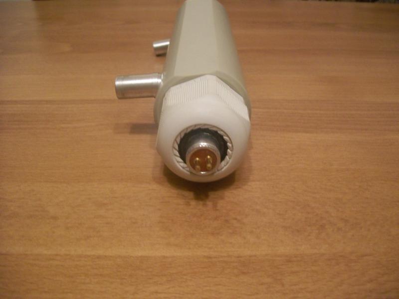 ШТУЦЕРА. Ну то, что из нержавейки - это понятно, хотя варианты имеют право на жизнь. Более интересен вопрос об их размещении и здесь - вторая "фишка". Идея заставить воду обтекать лампу по спирали понравилась изначально. Решение, как по-мне, лежало "на поверхности". Заключается оно в том что-бы подавать воду не на лампу, а в промежуток между последней и стенкой трубы, что неминуемо приведёт к завихрению потока вокруг лампы. Для реализации необходимо всего-лишь сверлить отверстия под резьбу не в оси трубы, а с возможным смещением. Справедливости ради нужно сказать, что просверлить, а тем более соосно отверстию нарезать резьбу, просто "на коленке" вряд ли получится - нужен станок. Но ведь под гермовводы тоже резьба режется не на кухне. Резьбу на штуцерах решено было нарезать G1/4, сами штуцера - под шланг D12.