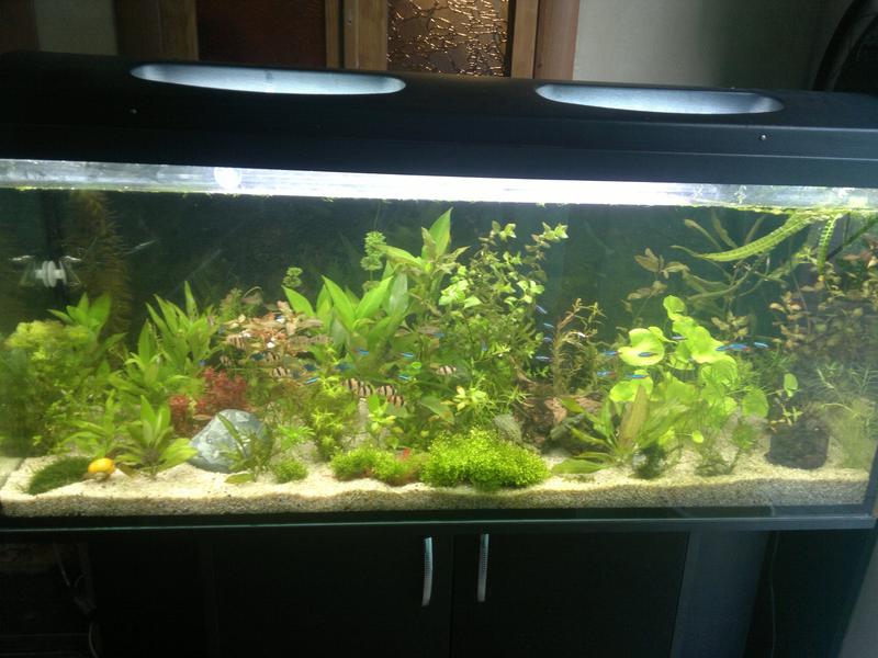 Созвонились, попросил совета по запуску и его УДО. Проблема состояла в том, что аквариум стоял в летнем домике и запуск был всего на месяц - потом аквариум нужно будет опорожнять и перевозить. Ну думаю как раз наберусь опыта за месяц) Заказал всяких растений, УДО у DEPSa, выкинул свой морской венигрет с пляжа( хочу заметить что вода у нас достаточная жесткая, артезианская pH-8, GH 13-14, KH 10-11) Купил кварцит 3-5мм, переделал крышку сделав примерно 1Вт/л, СО2, внешник RESUN и ЗАПУСТИЛСЯ) Причём в силу отсутствия терпения запускался быстро. На второй день были посажены растения, на третий день уже заселен барбусами, неонами и маленькими сомиками))) Само собой темпы роста у меня были далеки от того как перла растючка у Прохора, но я всё равно не мог нарадоваться своим аквасом. Долго не мог поймать соотношение нитрат фосфат. Нитрат был 10-15, а фосфата едва доходило до 0,5 и пока я не залил правильную дозу РО4 макро не лил, только микро чередуя с хеллатом Fе. К сожалению сам запуск я не додумался сфоткать. но гдето через дня три сделал несколько снимков