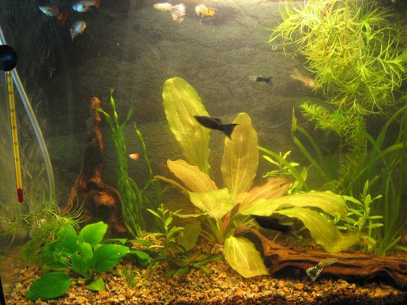 было бы неплохо травку все таки укоренить как нибудь. Корни валиснерии у поверхности воды выглядят уж очень несстественно. И анубиас (вроде это он) можно было б прикремит в камушку на дне. А так очень неплохо.