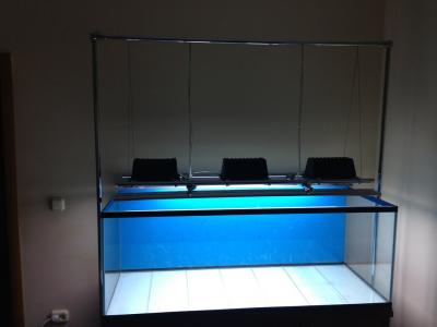 Но появилась небольшая проблема, при высоте тумбы 60см от пола+ 60см аква+ 24см до стекла прожектора = 144см , происходит засветка комнаты и соответственно свет бьет в галза всем кто присел и прилег, так что прийдется из тонкого метала гнуть светильники - купола, что в принципе и прибавит немного эстетики светильнику, а то торчащие элементы крепленияи сопряжения элементов не очень то и радуют глаз, но это чуть позже.