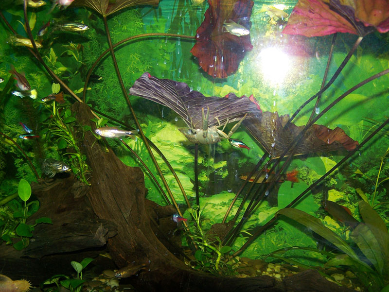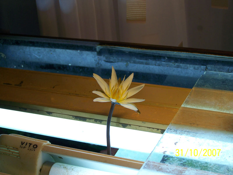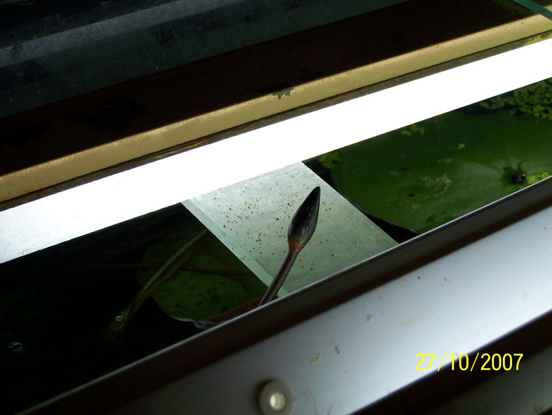 Цветок цвел около 2-х недель, когда цвел первый цветок нимфея пустила вторую стрелку. Но рост второй стрелки значительно медленней, чем был у первой. Сама нимфея чувствует себя хорошо, а вот окружающие растения не очень, т.к. плавающие листья закрыли 1/3 поверхности воды в аквариуме. Поэтому крышку пришлось с аквариума убрать, чтоб цветку было где цвести. И еще, если раньше нимфея пускала у меня боковые отростки, то сейчас новые клубни появляются прямо на плавающих листьях (это хорошо видно на одной из фотографий). Такие клубни есть практически на всех плавающих листьях.