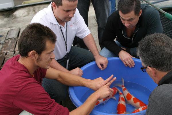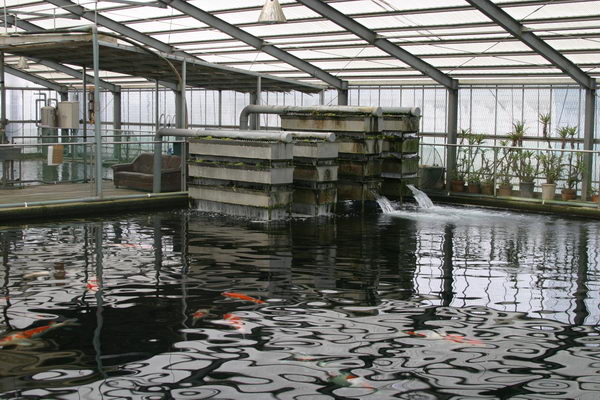 Получив право на душ и часовой отдых, нас повезли на ферму Окаяма Момотаро Кои. Момотаро – это одна из самых больших ферм в Японии. Одной из достопримечательностей фермы является наличие огромного 1500-тонного бассейна для карпов кои. В нем плавало много крупных карпов, среди которых 101-сантиметровая Санке, которая выиграла Японское кои шоу в 2002 году. Качество и количество огромных рыб просто завораживало. Вся система фильтрации на ферме работает по принципу орошения (Bakki shower), то есть вода подается в лотки, наполненные специальным запатентованным фильтратом Bacteria House. Маэда-сан, хозяин фермы, рассказывал, что он хотел в своих бассейнах повторить экосистему, подобную чистым горным рекам, потоки которых постоянно разбиваются об каменные пороги. Хочу заметить, что он добился этого: вода в бассейнах – кристальная, и, при 3 метрах глубины, видно рыбу на самом дне.
