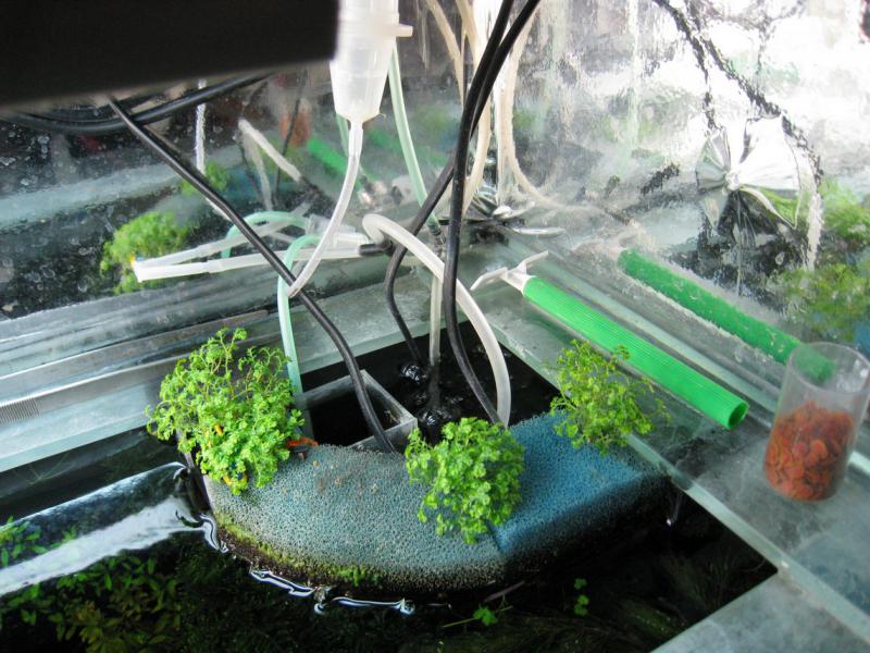 подача 1 пузырек/сек., на ночь выключается. Её выход на "фото 2" справа вверху, задекорирован роголистником.