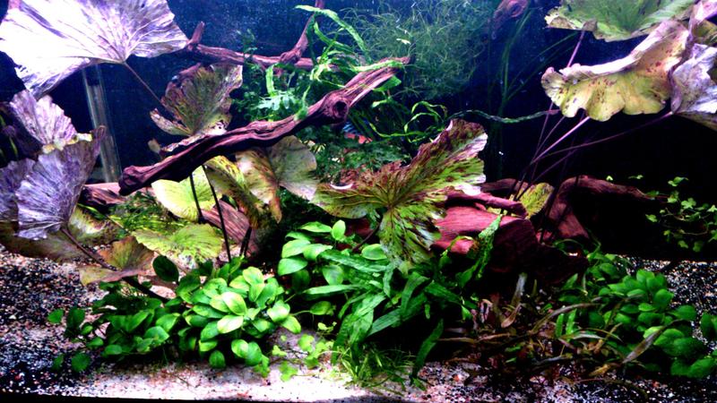 Всем добрый вечер,в связи с "мало места" был приобретен аквариум на 350л для любимых дискусов,много нервов потрепал нам этот акваруим,одно не так другое,ну да ладно пережили)))И вот наконец то состоялся запуск около недели назад.Изначально не планировалось ни каких растений!только коряги и немного анубиасов,но так сложилось что не смогла я устоять и были привезены пара кустов нимфеи,папоротники,пара мхов,так как все садилось в уже запущенный аквариум и думать и пересаживать особо то не удобно,то вышло все вот так,а может кто чего и посоветует. Папоротники просто воткнула в подходящие щели в корягах,мох аккуратненько привязала. Света очень мало всего 4 лампы по 25вт вроде, 2шт Аква стар и 2шт Пауэр гло, завтра возьму еще пару ламп. С лампами такая беда что их по всей длинне не хочу,а только над участком с растениями,поэтому по вт,оно не много выйдет. Под нимфею и крипты положила глину, со2 в акве не планируется, удобрения могу лить,только будет ли от них толк?, внутренник забит цеолитом,и постоянно работает УФ стерилизатор,температура 29,5,gh-kh не знаю (есть тест полоски тетра могу поглядеть),ph сера капельный тест показывает 8.0,при том что из крана бежит между 6,5-7.0.