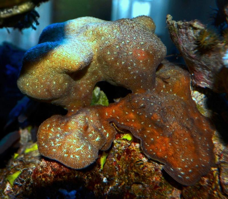 Симфилия, Эхинофилия, Монтипора зеленая - 2 куста, монтипора кирпичная - 2 куста, Эуфилия - 8 кустов, Зоантусы - 5 кустов, Стилофора - 7 кустов, Саркофитон, Синулярия, Горгонария - 2 куста, Акропора - 2 куста, Дискоактиния Юма, Дискоактинии полосатые - 10шт. Дискоактинии обычные - много.