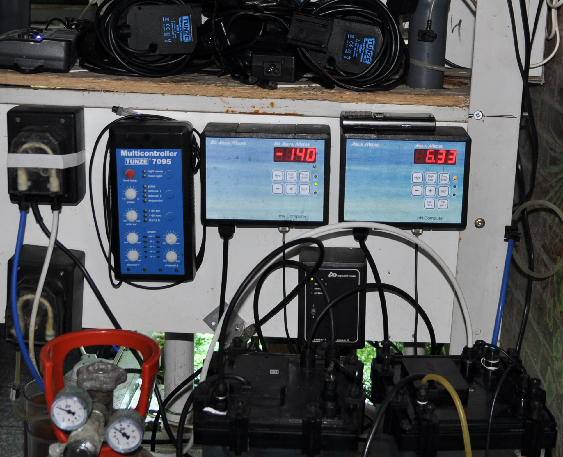 Помпы задекорированные под камнями,их не видно.На боковых стенках кораллы висят на магнитах.ЛЛ 4 шт. solar ultra marin day и 4 шт.solar ultra marin blue.Помпы