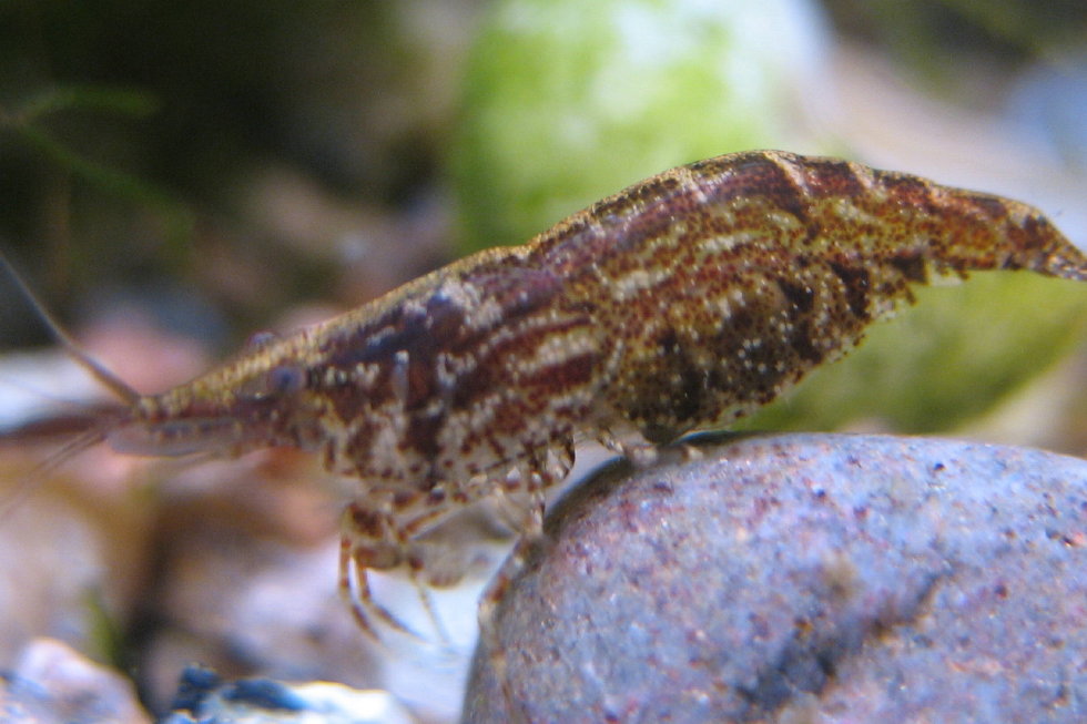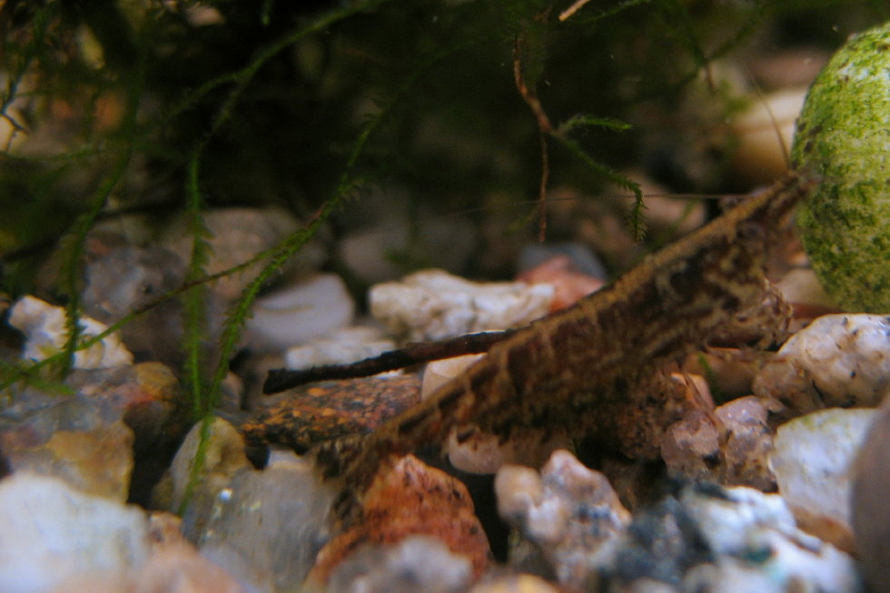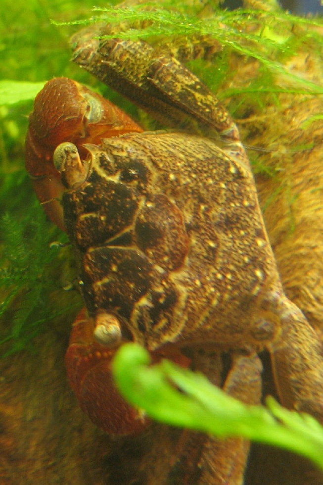 По-утрам воюет с ампуляриями за корм, щипает их, а они сжимаясь отстреливаются от него как ракеты. Шустрый очень, сидит вверху акваса, на капусте, только приоткрываешь крышку как он галопом по огороду в другой конец банки. А так он очень безобидный, первый никого не трогает. Криль пытается на нем поездить, он их клешней, но не справится ему, проворности нет такой.
