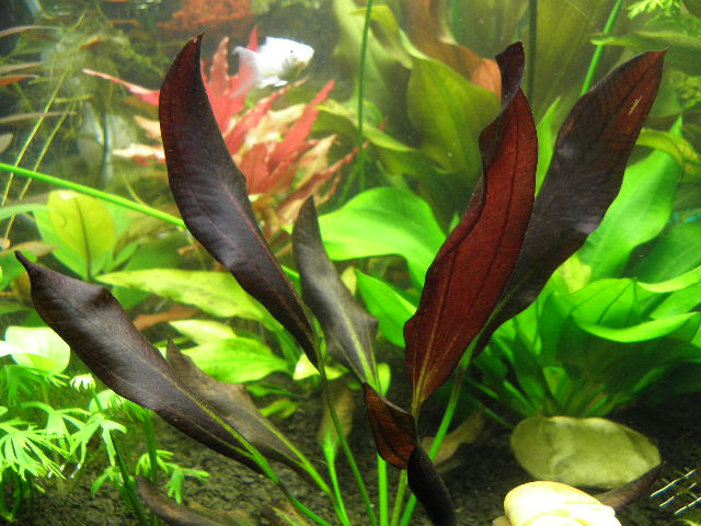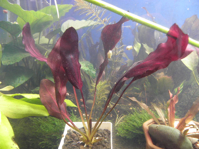 Мне он очень нравится. Декоративен и среднего размера, не занимает много места, так как редко держит более 10 листьев. Старые листья постепенно отмирают и чем лучше будет в аквариуме баланс, то тем больше будет держать листьев. Особенно от нехватки азота отмирают быстро старые листья. В тени будет не красный, а ближе к самому темному красному- бордовому, не зеленеет никогда. Стрел вообще не дает. Размножение очень затруднительное корневищем с большого маточника. Прикорневики не давал у меня еще. Но получалось с корневища вырастить детки: