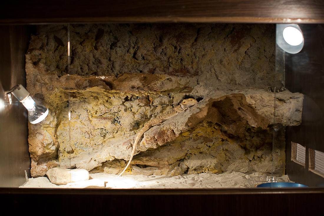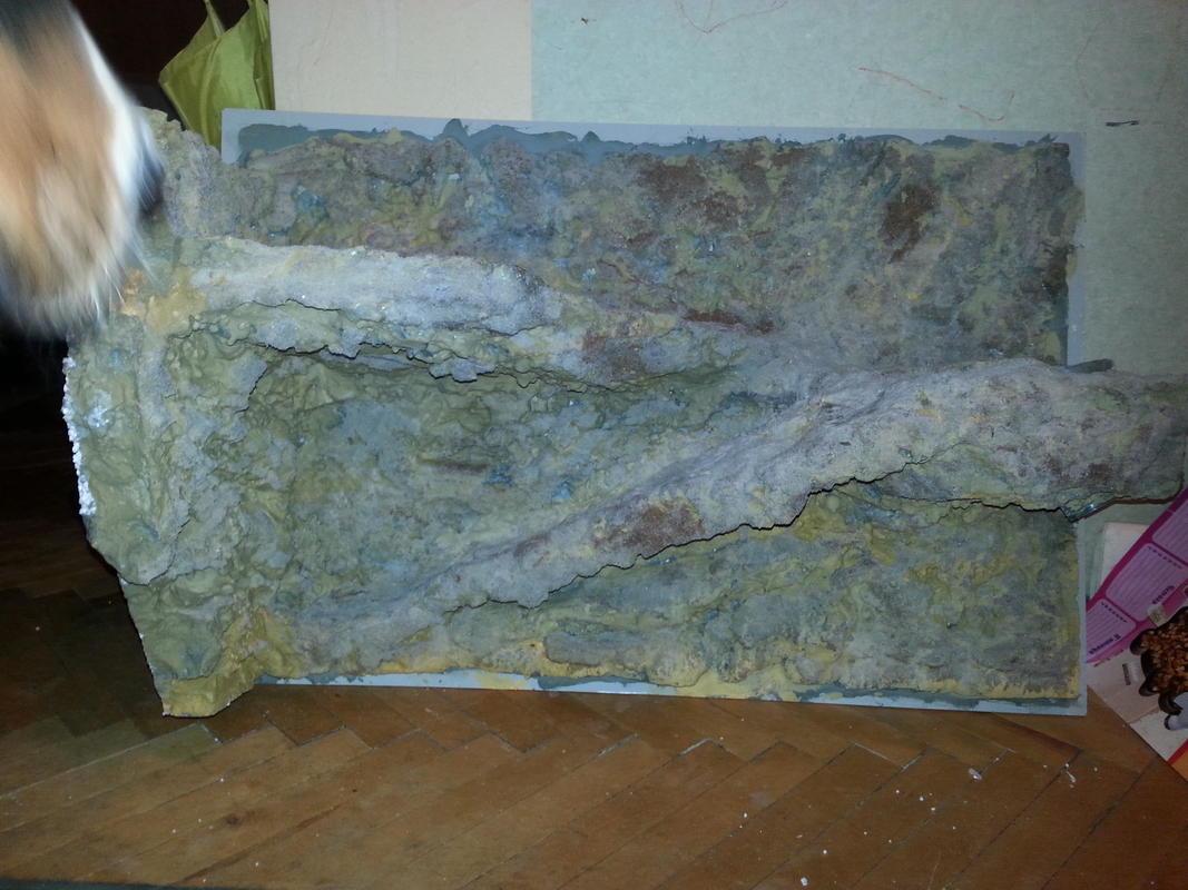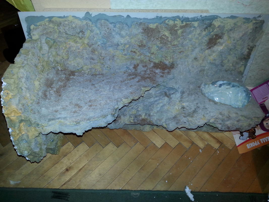 так как и у даррелла "ребенок дефективный- в каждом коробке скорпионы" так и я своих малых поближе к природе)). а тут им еще и агаму бородатую подарили. размер см 40.. самец. сначала я ему сделал тер из дсп размер 90х40х60. потом сделали подогрев- електроковрик между двух стекол( и контакты спрятаны еще и все залито силиконом от влаги). он там млеет. но в коробке сидеть ему может и ничего, но мне никак не нравится, потому решил усложнить ему задачку добирания до пищи и других благ. так как планировал фон еще раньше ,то вырезал две стенки двп ( одна с фоном, другая на смену пустая). пенопласт- пена- потом обработал цементом с пигментом в два слоя. и уже потом силикон растворил на уайт-спирите намазал и обсыпал песком вперемешку с кокосовой трухой. самое интересное это я на первом балкончике сделал мини бассейн. он пока в процессе все равно выветривать неделю буду. взял 6 литровую бутылку срезал под углом и врезал в основу. снизу она закрывается крышкой. а изнутри будет плоская галька на силиконе. такую конструкцию выбрал для облегчения уборки в бассейне))