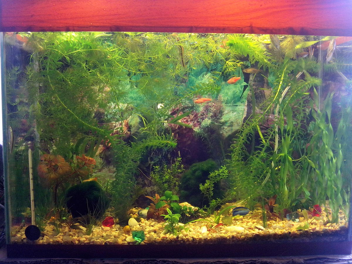 Сам аквариум был тщательно выдраен от зеленых и черных наростов на стекле. Грунт был промыл в проточной воде потом прокипятил минут 20. Растения также были местные, промыл в проточной воде, перебрал, большую часть пришлось выкинуть, оставил те что были более чистые (как потом вычитал понимаю что в аквасе была (да и наверно осталась) черная борода и/или что то их этих вредных водорослей). Воды отстоянной понятно что не было, брал с бювета. Пришлось старую отфильтровать немного (пропустил через несколько слоев сентипона) и где-то 60 на 40% (старя / новая) залил в аквас. Воду подогревал на газу и разбавлял. Света одна экономка 4100К на 20Вт.