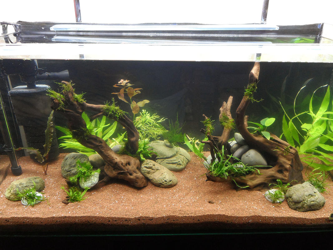 День второй. Муть от манадо осела... хотя и мыл его три раза - всё равно очень пыльный, но зато лёгкий  По газу планируется бражка... со второй недели. Диффузора нормательного нет, городить колокола не хочется..поэтому скорее всего разбивать пузырьки СО2 в пыль будет акваэль турбо.. Световой день сейчас 5 часов, постепенно буду добавлять. Из УДО буду использовать продукцию тм Птеро, но пока об этом еще рано говорить. Думаю через недельку начать сыпать калий в виде сульфата. По поводу круглых камней - да, есть такое дело - они родом с морей) Но вроде не фонят, уксус ничего подозрительного не показал... Да и уберу я их скорее всего, как коряжки окончательно воды наберутся. Вот что меня начинает беспокоить - так это то, что некоторые растения, в частности папоротники - достались мне с нитчаткой...я её недосмотрел, а теперь она похоже себя стала очень вольготно чувствовать  Вот я и думаю... что с ней делать. То ли просто упорно выбирать вручную, то ли еще плюсом бухнуть птеро альгин супер?...