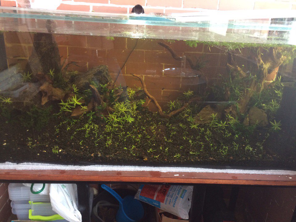 И несколько выигранных лотов спустя в аквариуме появилось очень много гетерантеры остролистой (спасибо FLAG), Хемиантус микрантемоидес (спасибо Khmel). И папоротники, которые я устал куда-то цеплять уже через 20 минут (спасибо Yurskiy), поэтому половину просто прикопал в грунте.