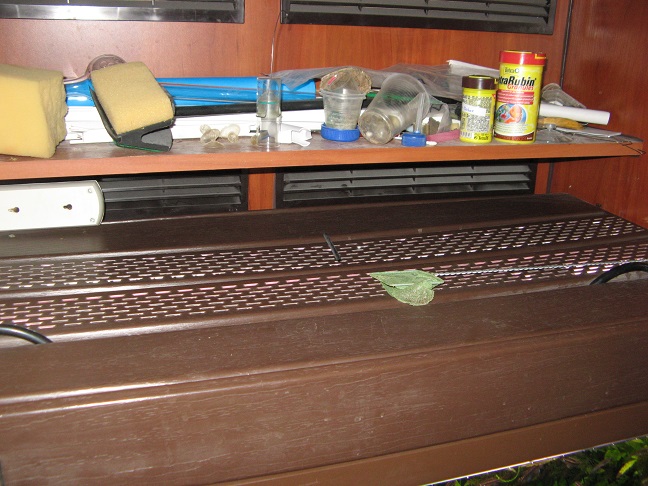 Подсветка. То же самодельная. Изготовлена из ПВХ софитной панели коричневого цвета. Укомплектована лампами 3х30Вт + 2х18Вт (лампы аква и флора). Эпра китайские. Кнопки включения находятся на передней панели крышки. Крышка выполнена в виде рамки, две верхние панели имеют перфорацию и легко снимаются. Некоторые места нужно подклеить.