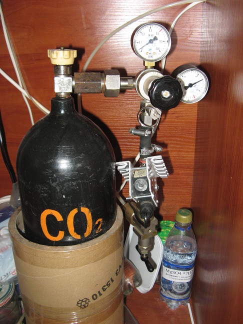 Система СО2 Два неповереных баллона по 5 литров каждый. Один полный, второй еще работает (баллоны от водолазной ус тановки). Углекислотный (Днепропетровский) редуктор, эл. клапан Камоцци 220В, кран тонкой настройки (достаточно габаритный игольчатый кран из угольной промышленности). На работу нареканий нет. - 1200 грн.