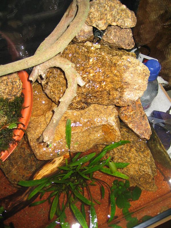 Как видно на фотках, я просто уложила несколько камней, которые покрыла кусочком мха, уложила кокосовую палочку(кусочек палочки)для цветов. Она создает отличный и удобный выход из воды, плюс мягенькая. Жерлянки ее сразу оценили  . Водички немного...подростут, переедут к одинокому самцу.