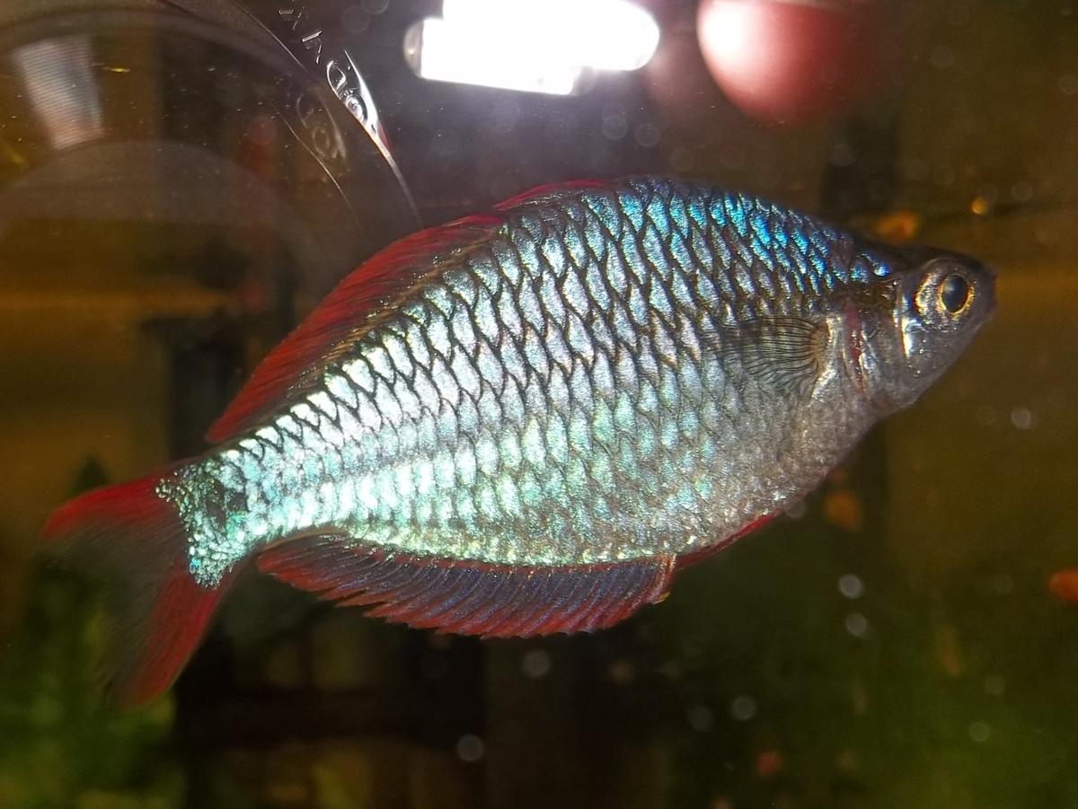 одна из радужниц зависает над поверхностью воды, часто дышит, наклон тела как на фото, постоянно. Никаких высыпаний, выделений, гнили и др не видно, если спугнуть ныряет в стаю и ведет себя как все здоровые рыбы. У рыбы немного вздут живот, но это самка и рыба постоянно нерестится в аквариуме.